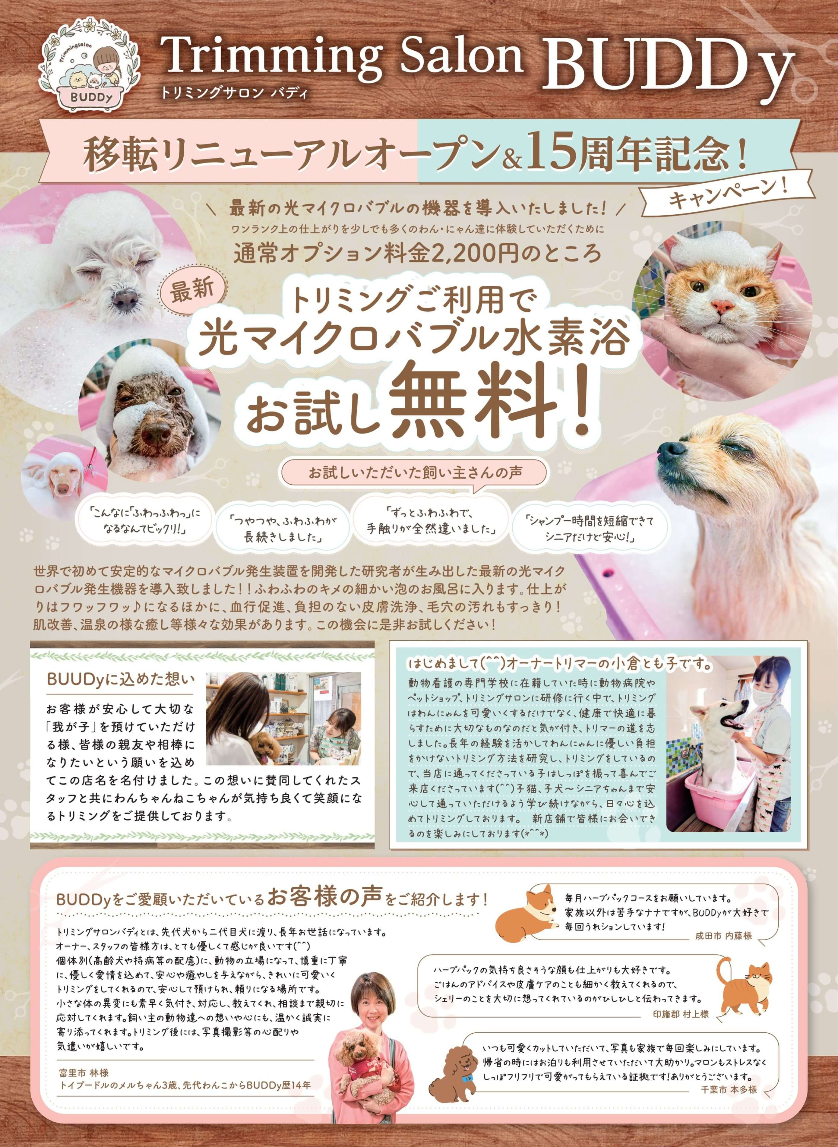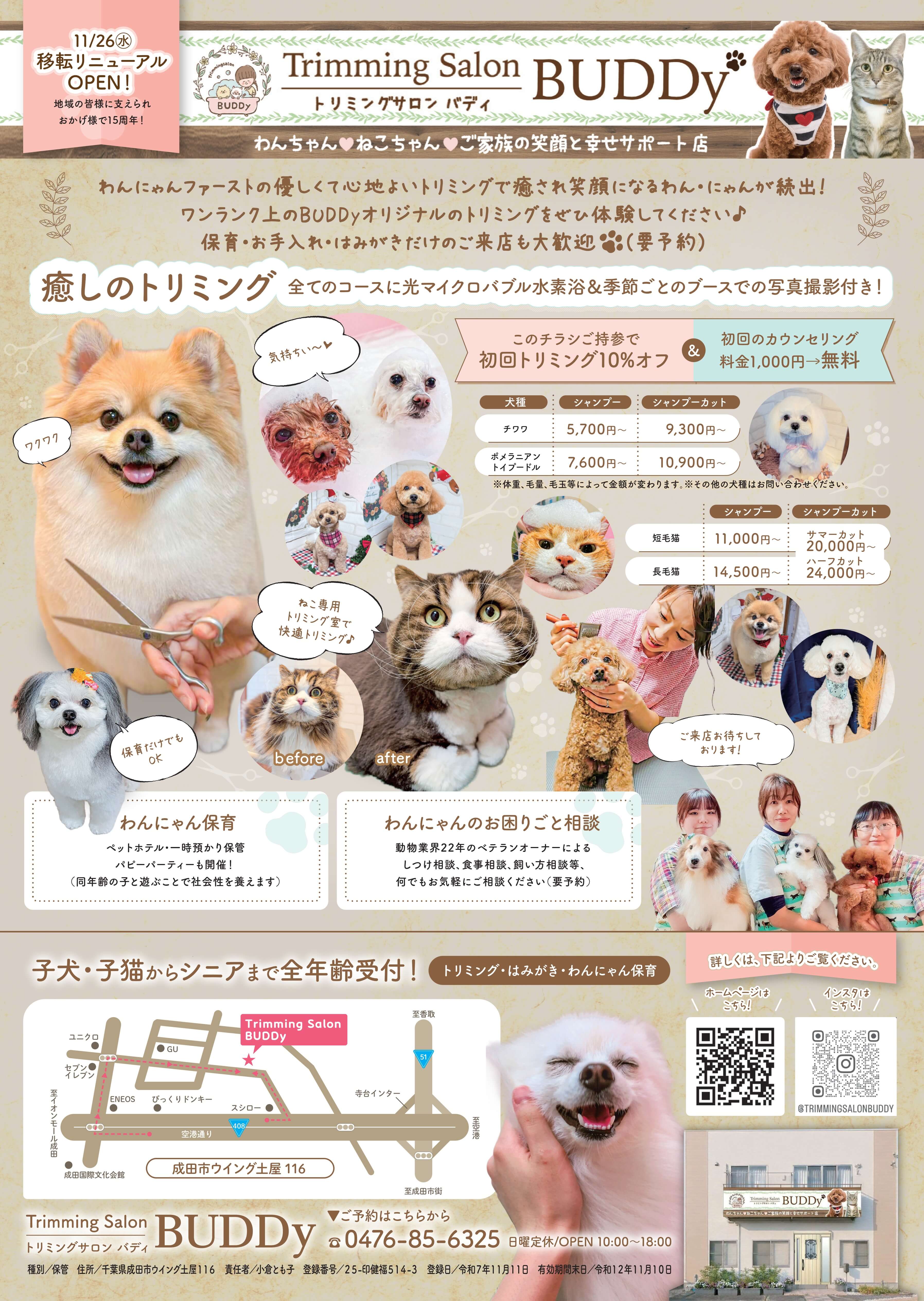 この度、『Trimming Salon BUDDy』は、 2025年11月26日(水)より新天地(成田市ウイング土屋)にてリニューアルオープン する事となりました。